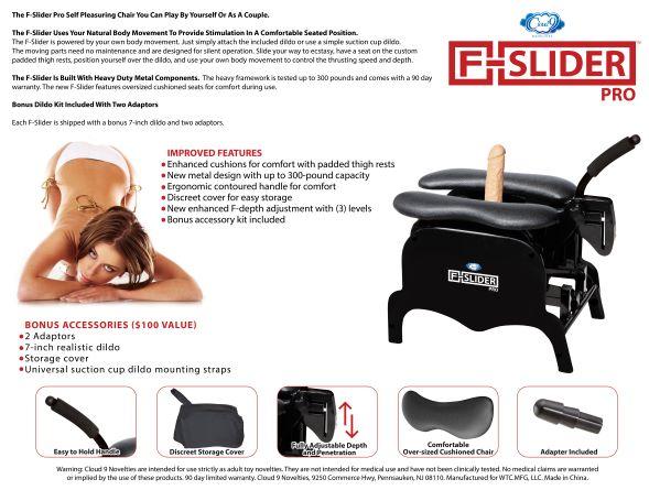 Cloud 9 F-Slider Pro Heavy Duty Self Pleasuring Chair sex machine with $150 bonus attachments including storage cover. The F-Slider uses your natural body movement to provide stimulation in a comfortable seated position.