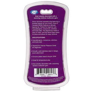 Compatible with water based lubricants. Clean with mild soap and warm water after use. Smooth, solid stainless steel in design, jewel adornment. Chrome Plated Stainless Steel & Acrylic Gem. Great for temperature play. Anal Jewelry decorated with a stunning rainbow multicolor gem. Body safe Stainless Steel and Acrylic Gem. Great for temperature play. Weight .18 pound. Height 3.7 inches, diameter 1.24 inches. Video.