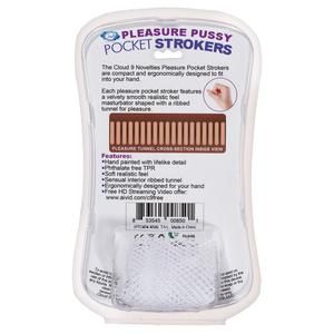 Cloud 9 Personal Anal Pocket Stroker with bonus drying pouch. Color Tan. The Cloud 9 Novelties Pleasure Anal Pocket Stroker is compact and ergonomically designed to fit into your hand. Each pleasure pocket stroker features a velvety smooth realistic feel masturbator with a ribbed tunnel for your pleasure. Features: hand painted for life like details.