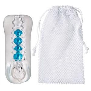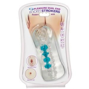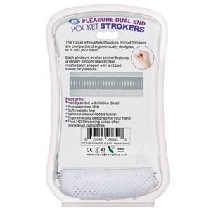Cloud 9 Dual Ended Pleasure Pussy and Ass Double Ended Beaded Stroker with bonus drying pouch. Color Clear. The Cloud 9 Novelties Dual Ended Pleasure Strokers are compact and ergonomically designed to fit into your hand. Each pleasure pocket stroker features a velvety smooth realistic feel masturbator with a ribbed tunnel for your pleasure.