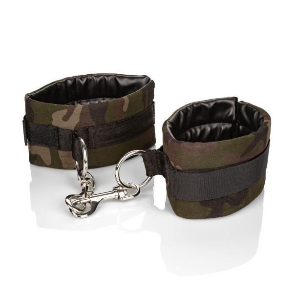Totally adjustable cuffs with Velcro style closures for use on wrists or ankles. Thick and durable camo fabric on one side with comfortable vegan leather on the other. Universal clasps and D-rings with swivel design. Dimensions cuffs circumference 19 inches. Package 1.5 inchesby 8.5 inches by 14.5 inches.