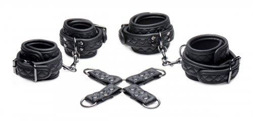 Bind your playthings wrists and ankles with these attractive quilted cuffs, made of a leather like material that is sturdy and elegant. A bonus hog tie adapter is included to immobilize them in the most vulnerable positions for easy access to all their naughty bits. Attach the 4 D-rings of the hog tie with the swivel clasps to restrain their limbs in your desired configuration in front of or behind their body.