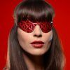 Enjoy the sexy contrast design of embossed black and red vinyl while your plaything experiences the sensations of sight deprivation. The blindfold itself is lined in a soft yet durable neoprene for a sensual and comfortable play session. The strap is made of a stretchable elastic material, for a fitted grip around the head and a one size fits most design. Measurements 7.75 inches in width, 2.5 inches in height, stretches to fit heads approximately 24 inches around. Materials Vinyl, elastic, neoprene. Color Red.