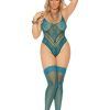 Crochet Lace Teddy with Cut Out Detail and Stockings Dusky Jade Queen Size from Elegant Moments Lingerie Hosiery. Crochet lace teddy with cut out detail and matching stockings. Size Plus, Queen Size. Color Dusky Jade. Materials fabric content 90% Nylon, 10% Spandex. Ladies plus, queen size. Height 4 feet,11 inches up to 6 feet. Weight 165 pounds to 240 pounds.