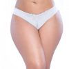 The crotchless pearl thong features an open crotch, lace front detail and pearl strand. Fabric 90% Polyester, 10% Spandex. Ladies plus size 1X/2X. Waist 32 inches to 40 inches, Hips 42 inches to 50 inches. Color White. From Oh la la cheri lingerie.