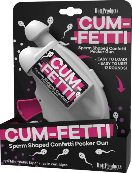 Cum-Fetti Gun from Hott Products. Sperm shaped confetti gun. Easy to load. Easy to use. 12 rounds. 6 pack mini bullet style snap in cartridge.