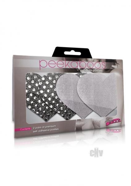 Peekaboos Premium Pasties. Wear more revealing fashions! Cover up with style! Lasts as long as you do. Dance all night without even a slip. Fun as a flirty fashion add on or just as premium pasties. Contains two pairs of premium self-adhesive pasties. Dark Angel Hearts Silver.