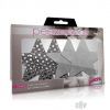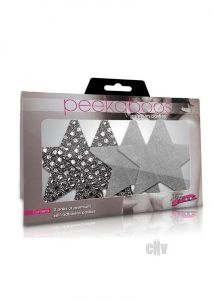 Peekaboos Premium Pasties. Wear more revealing fashions! Cover up with style! Lasts as long as you do. Dance all night without even a slip. Fun as a flirty fashion add-on or just as premium pasties. Contains two pairs of premium self-adhesive pasties. Dark Angel Stars Silver.