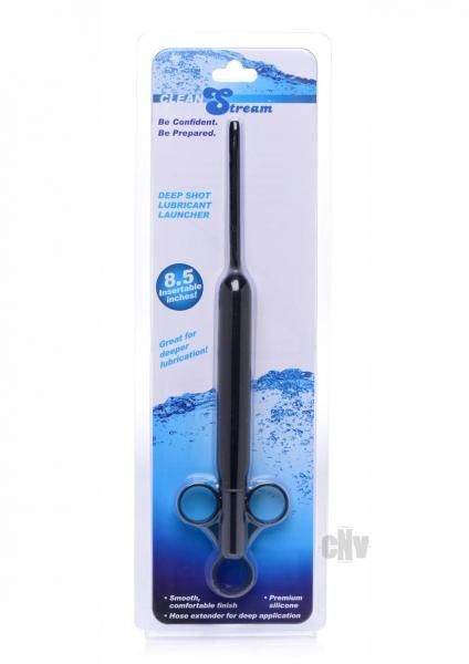 This silicone lubricant launcher is equipped with an extra long and flexible hose for deep application of lubricants into your hole of choice. For those playing with longer toys needing lubrication past normal depths, this launcher is perfect for sending lube to your deeper parts to make insertions more comfortable past entry. The premium silicone used for this launcher is phthalate free, non porous, and body safe so you can insert and apply with peace of mind. Take pleasure in the application of lube with the silky smooth texture! The 8.5 inches of smooth flexible silicone is great for anal, vaginal, or urethral application. Be sure to wash with warm water and mild soap before and after use. Measurements: overall length 11 inches, insertable length 8.5 inches, widest diameter 0.77 inches, narrowest diameter 0.24 inches Materials: Silicone and ABS plastic (phthalate free) Color: Black