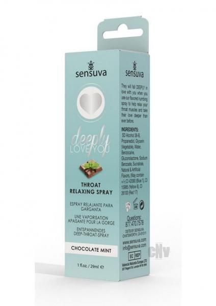Sensuva’s Deeply Love You Throat Spray works its delectable magic for a more intense oral sex session. This spray is flavored and makes a treat for your tastebuds while relaxing the throat muscles to help reduce the gag reflex and therefore being able to deep throat during oral sex.They will fall deeply in love with you when you use this flavored throat desensitizing spray that helps relax your throat muscles and take their love deeper.TIPS:Spray 1-2 PUMPS into the back of the throatThe effect takes place immediately. Feel free to add more if desired.Benzocaine creates a slight numbing sensation to relax the throat muscles.Slightly sweet & available in five flavorsWater-based product; contains healthy ingredientsFun fact: Great for sore throats & toothaches, too!