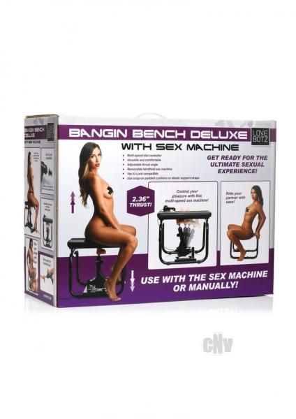 Intensify your solo sessions and spice up your couple’s play with this Deluxe Bangin’ bench with included sex machine! The comfortable bench has two, wide, elastic straps that create a supportive seat that you can bounce on when using with your partner or a personal toy. The wide straps can be switched with the firm, plush, PU leather cushions for when using with the sex machine. The steel frame is durable and can handle up to 220 lbs of weight; don’t be shy about giving it your roughest thrusts and rides! A sex machine that is perfectly compatible with the Bangin’ Bench can be attached the the bars and mounted in place so the power-packed thrusting can reach your wet and yearning holes! Adjust the angle of the dildo so you can enjoy multiple different positions that hit your sweet spot while you are seated above, angled forward, leaned back, facing front or reversing your position! The Bangin’ Bench helps you get your juices flowing with the machine or with a partner positioned below you! The dildo is made out of TPE (thermoplastic elastomer) rubber and is realistic with veins and a firm but flexible core. The dildo and machine can be used separately from the bench while you’re positioned on a chair, table, couch or on all fours! Control the thrusting using the variable speed dial on the corded remote. The thrusting sex machine is powered by plugging it into a wall outlet. Enjoy up to 195 thrusts per minute and get blown away by the power! Go beyond the Bangin’ Bench and include a perfect companion to it by adding the sex machine, as well! As you sit your bottom on the elastic straps, the slit in the center parts just wide enough to expose your wet and horny hole. With the remote in your hand and the dildo angled just right, turn the power on and enjoy the speedy and strong thrusts of the dildo as you let yourself receive a tireless pounding! Adjust the angle to get at your G-spot or P-spot. Get deeper to have a cervical orgasm or enjoy the A spot and K spot, too! Swap out the firm cushions for the bouncy elastic and get lower to the ground! At this lowered level you can ride your partner’s face, bounce on their firm member, or use your own personal dildo and toys as well! Lean forward, lean back, face front or backwards, even rotate your hips in circles to enjoy all that the bench has to offer! Relax and use plenty of water-based lube with the rubber dildo from the sex machine so you can keep on coming again and again! To clean the PU leather use a damp cloth and toy cleaner to gently wipe it clean. Use isopropyl alcohol in a spray bottle for more serious cleaning. For the elastic, wash on a gentle cycle on cold or soak in soap and water before rinsing off and air-drying. To clean the dildo, use mild soap and warm water then rinse and spray with a toy cleaner. Do not submerge any electronics in water. Unplug the machine before cleaning. Measurements: (LxWxH= 50.8 x 54.6 x 47 cm) Length: 20 inches. Width: 21.5 inches. Height: 15 inches with elastic straps, 18.5 inches with padded seats. Dildo: 6.75 inches overall, 5.5 inches insertable, 1.8 inches widest diameter. Thrust length: 2.36 inches. Max weight limit 220 lbs Materials: Steel, PU leather, elastic,TPE, ABS plastic Color: Bench: Black, Dildo: Light