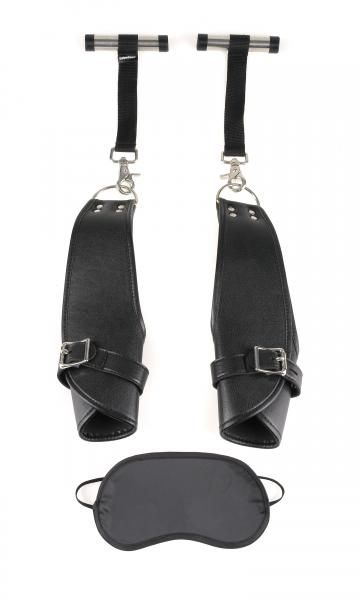 The cuffs attach to thick nylon straps which connect with metal clips and heav duty D-rings, assuring your subject will not escape any time soon. The heavy duty leather suspension cuffs wrap around the wrists and easily adjust to fit most sizes, while the strong belt buckles prevent your subject from escaping. The cuffs can be used for suspension and allow your subject to safely hang from their wrists without cutting off circulation. Explore new positions and new scenarios you never thought were possible, all while your partner is bound, suspended, and at your mercy. Features: love mask included. Unisex.