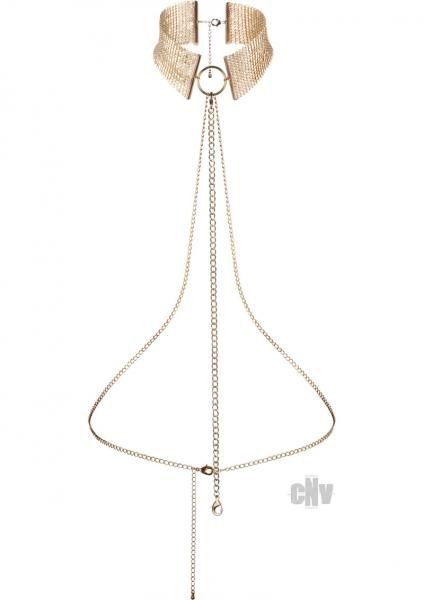 Unleash your imagination and surrendering to pleasure is easy with this adjustable metallic mesh collar, and cooling metal chain that drapes the torso and waist as an chain belt. An easy to wear collar for any occasion and a suggestive bedroom accessory for soft bondage games.