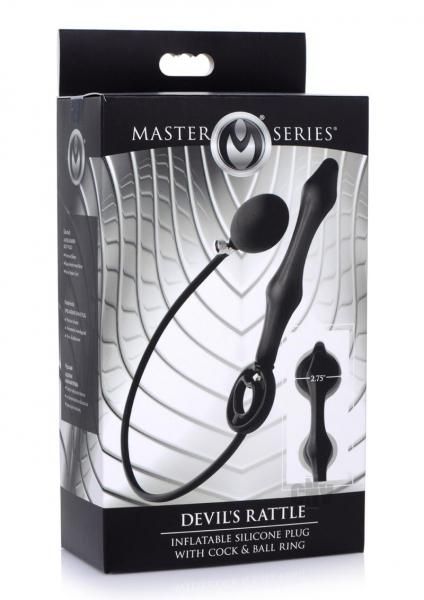 This inflatable silicone plug has it all! The Devils Rattle is an anal toy packed with unique features to satisfy your kinky wants and needs – featuring an inflatable plug, flexible cock and ball ring, and internal balls to rattle and drum against your anal internals with every movement. This silky anal delight is perfect for players looking for a versatile toy that checks all kinds of boxes! This devilish delight is made with silky smooth and super flexible silicone. Phthalate free and soft for a comfortable anal introduction, and body safe for worry free play! The included pump easily detaches from the silicone plug while keeping it inflated – pump to your preferred level of fill and detach the pump to enjoy internal bumps and rattles with every movement! The stretchy cock and ball ring slip over your shaft and sack to enhance your erection and provide a bumpy texture for your partner. Compatible with water based lubricants only! Measurements: Insertable length 6.5 inches, widest insertable diameter 1.2 inches deflated, 2.75 inches inflated; cock ring unstretched diameter 1 inch, ball ring unstretched diameter 1.75 inches. Materials: Silicone, Metal. Color: Black. Key Features: Inflatable Rattlers, Velvety, Flexible Silicone, Customizable Pump, Stretchy Cock and Ball Ring.