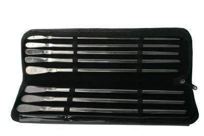 What makes this sounds kit different? The Dittle Sounds are made out of chrome plated brass. These babies are also very long. Measuring 16 inches in length. One end is flat, making it a great connector for electrical play! 8 sounds in total make up the set. You can now order this kit in two size sets: small/medium (which run from 8 to 22 french) or approximately .105 inch to .288 inch and medium/large (which run from 18-32 french) or approximately .236 inch to .419 inch. The sounds are protected in a velvet lined zipper case.