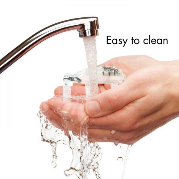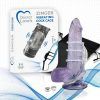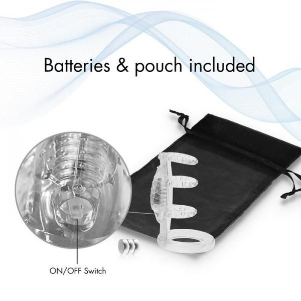 Doctor Love Zinger Vibrating Sleeve Clear. Batteries and pouch included. 11,000 vibrations per minute. On and off switch. Easy to clean. Comfortable. One size fits most. Sleeve measures 2.25 inches wide by 3 inches in length. Top ring measures 1.25 inches in diameter. Bottom ring is 2 inches in diameter. Rings are textured for added stimulation. Please note shown on dildo, not included.