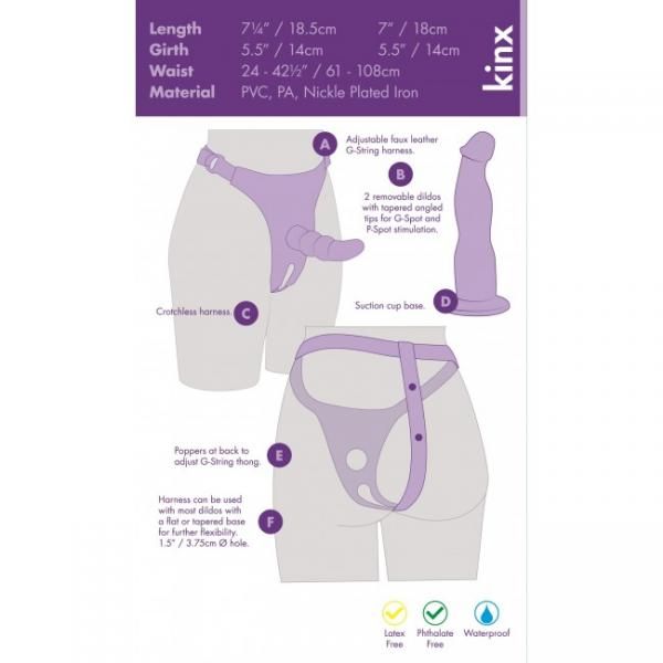 Double Tip Strap On. Double your fun and your pleasure with The Double Tip Strap On Set. It has a soft, high quality harness with nylon straps and steel buckles. The Horny Tip dildo is made from soft transparent jelly, with a double flanged shaft and G-Spot tip. The Penis Tip is also soft, transparent jelly with a subtly tapered shaft and realistic penis tip. Both of these didos fit snugly into the harness or can be used separately. 7.25 inches long 5.5 inches girth. 7 inches long girth 5.5 inches. Waist 24 inches to 42.5 inches. Dildo made using phthalate free, latex free PVC.