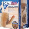 Measurements body 11.5 inches wide, 8.5 inches tall, 6 inches in depth. Dildo 8.5 inches in length, 5.25 inches in circumference. Materials SexFlesh Thermoplastic Rubber TPR. Color Beige.