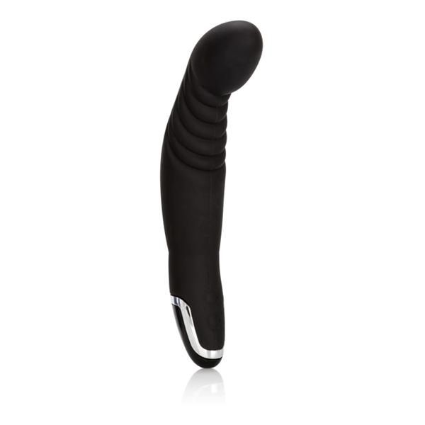 Dr. Joel Silicone Ridged P Silicone. Perfectly curved Silicone probe for ultimate contact and stimulation. 8 functions of vibration, pulsation and escalation. State of the art memory chip resumes on last function used. Easy push button controls with auto on/off button. Waterproof. Materials: Silicone massager, ABS plastic cap, ABS plastic with Silver Plating decor. Vibrator requires 2 AAA batteries, not included. Bulk weight 5 ounces. 6.25 inches by 1.5 inches.