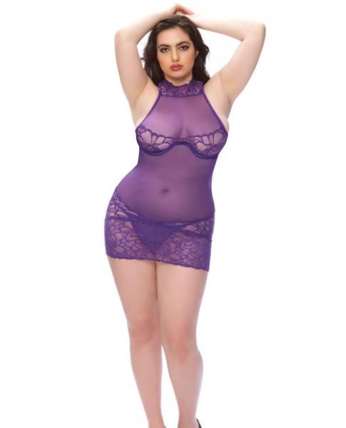 This flirty purple chemise set features a high lace neck, a sheer mesh neckline, sheer lace underwire cups, adjustable spaghetti straps, a hook and eye back closure, a sheer mesh and lace bodice, an open back panel, and a matching panty. Color Grape, Purple. Ladies plus size 2X. Cups D/DD. Bust 42 inches to 44 inches. Waist 36 inches to 40 inches. Hips 46 inches to 50 inches. Weight 190 pounds to 220 pounds.