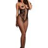 Open-cup bodystocking with knitted-lace “teddy”design, fishnet legs, open crotch and adjustable halter ties. (G-string and pasties not included).