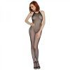 Seamless fishnet open-crotch bodystocking with halter neck and low back (thong not included).
