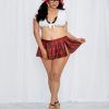 Knit crop top features lace neckline detail and tie-front closure; pleated mini skirt features plaid print and side slit detail.
