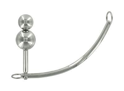 The DuoSphere is a devious combination of a double beaded, sliding anal plug and a curved bondage hook. One by one you can pop the cool steel balls into your partner, giving them a nice anal stretch. Once you slide the plug home, you are now free to adjust its position along the length of the bondage hook to suit your needs. Each end of the curved steel bar features a pivoting O-ring that allows you to attach ropes, chains, or whatever creative bondage equipment you have in mind. The top bead of the anal plug is removable, so you can choose whether your sub will experience both of the steel spheres or just one. Warm or cool the DuoSphere in water prior to insertion for some exciting temperature play.