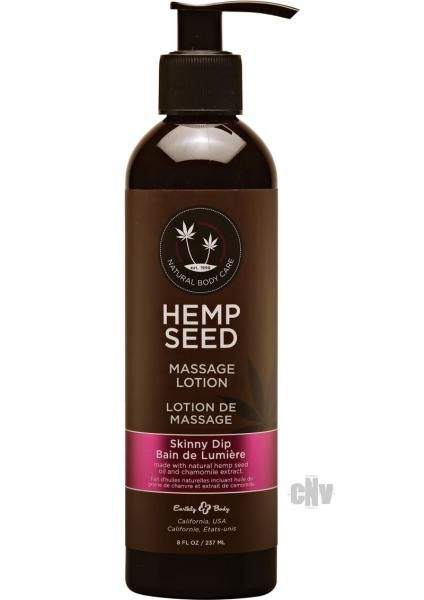 Now you can be transported to paradise with the inviting scent and satin feel of our nutrient rich massage lotion. Specially formulated with a blend of Hemp Seed and Argan Oils, this deep moisturizing lotion provides an ideal glide for the perfect massage that leaves skin feeling smooth and nourished. From Earthly Body. 8 fluid ounces. Scent Skinny Dip.
