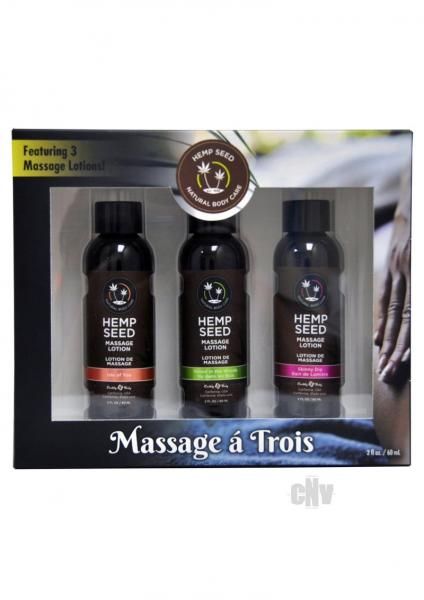 Earthly Body Gift Massage A Trois Box of 3 different 2 ounces bottle of Isle of You, Skinny Dip and Naked in the Woods Massage Lotions. Massage A Trois.