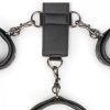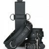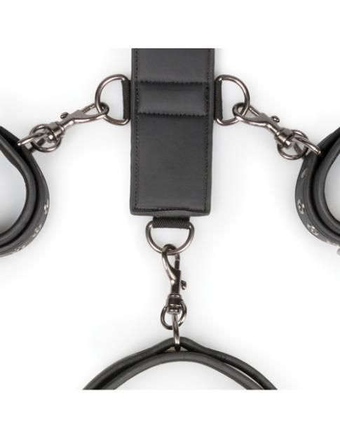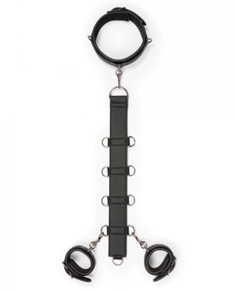 Show your sub who is in charge with this exciting bondage set! The set consists of a harness strap, handcuffs and a collar. Both the cuffs and the collar are easily adjustable for a perfect fit. The sturdy faux leather is lined with foam to prevent scratching and to ensure a comfortable use. The bondage strap has nine small D-rings and one large D-ring. The cuffs and the collar have clip fasteners attached to them, so you can easily attach them to the harness. Because of the length of the strap and the many D-rings, you can create your own bondage game and use this set any way you want.
