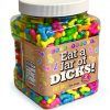 Eat A Jar Of Dicks 2 pounds from Candy Prints. Nutrition facts serving size 10 pieces. Amount per serivng 38 calories. 0% fat, % sodium. Total carbohydrate 2.8%. Sugar 6g. No protein. Percent daily values based on a 2,000 calorie diet. Ingredients: Dextrose, Corn Starch, Dextrin E1400, Magnesium Stearite E570, Artificial colors Red 3 E127, Blue 1 E133, Yellow 5 & 6 E102, E110, Shellac E904, Artifitical Flavor, Gum Arabic E414, Carnauba Wax E903.