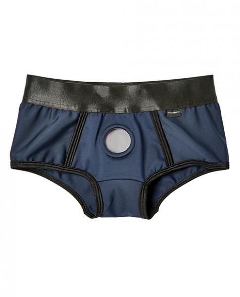Sportsheetts Em Ex Active Wear Harness Fit Harness Blue Extra Large, XL. Split Sides for extra pleasure. An active life style demands a comfortable, all day, all night harness. Em Ex was designed for durability, comfort, and fit. The soft fabric provides stretch while keeping accessories firmly secure. With its durable elastic waistband and nitrile rubber O-ring, you can fly the friendly skies as TSA will never know you are wearing it.