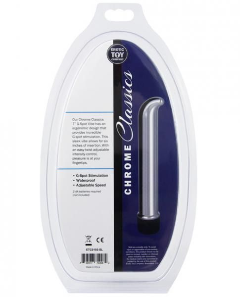 Erotic Toy Company Chrome Classics 7 inches Metallic G-Spot Vibe has an ergonomic design that provides incredible G-spot stimulation. This sleek vibe allows for six inches of insertion. With an easy twist adjustable intensity control, pleasure is at your fingertips. Waterproof. ABS Plastic. From Erotic Toy Company. Silver.