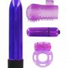 Measurements Slim Vibe has 5.38 inches overall length, 4.5 inches insertable length, 1.03 inches maximum insertable diameter. Finger Tickler is 2.25 inches long. Bullet vibe is 2.25 inches long with 0.75 inch diameter. Materials Thermoplastic Rubber TPR, ABS plastic. Color Purple. Please note 5 Inches Vibe requires 1 AAA battery, not included. Bullet Vibe requires 3 AG13/LR44 button cell batteries, included. Cock Ring designed for one time use 40 minutes, battery built in.
