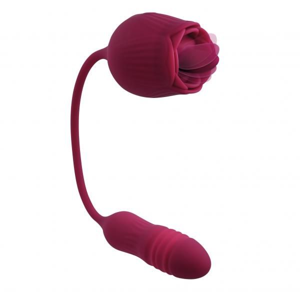 Evolved Wild Rose Red Vibrator has two unique sensations connect with a flexible cord in this extraordinary adult toy that delivers delicious pleasure in two exquisite ways! A textured, vibrating, thrusting bullet on one end ramps up to 10 speeds for a surprising spontaneous feel, while the velvet smooth rose at the other end surrounds a 10 speed vibrating, flicking tongue that targets with intensity. Experience one feature at a time or both simultaneously with independently controlled motors. Water submersible, easy to clean, USB magnetic rechargeable. Features: thrusting bullet vibrator with tongue flicking rose. Powerful 10 speed vibrating, thrusting bullet. 10 speed vibrating, flicking tongue inside rose. Connected by flexible Silicone cord. 2 motors controlled separately. Rose and bullet vibrator textured for stimulation. Easy to use 2 button control panel. Light Emitting Diode LED lights illuminate buttons when in use. Made from creamy smooth Silicone. Size height 13.61 inches, depth 2.19 inches, width 2.19 inches. Insertable bullet vibrator length 3.75 inches, insertable diameter 1.15 inches. .25 inch thrusting distance. Bulk weight under half a pound, .5 lb. Phthalate free and latex free. Waterproof vibrations and submersible in water for an out of the bedroom use. Magnetic rechargeable, USB cable included. 5 years warranty. Categories: Clitoral Stimulator, Rechargeable Vibrators, Tongue Vibrators, Sex Toys for Women. 2022.