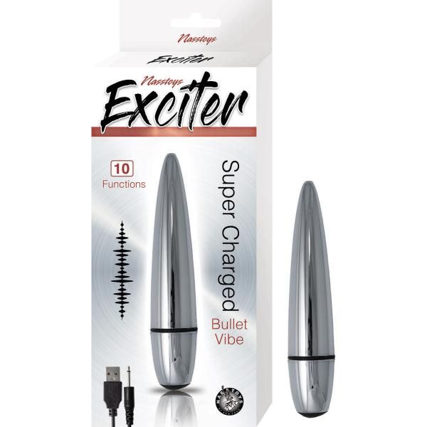 Exciter Bullet Vibe Silver from Nasstoys. Features: 10 function. Super charged. Water resistant. Phthalates free RoHS compliant materials. Material ABS plastic. Size length 4.75 inches, width .875 inch, diameter 2.75 inches. Rechargeable vibrator. Charging time = 60 minutes. Play, working time = 90 minutes.