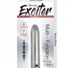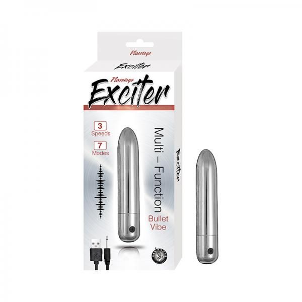 Add some excitement to your bedroom with the Exciter Multi-Function Bullet. andnbsp;This power packed 3 function, rechargeable bullet features a tapered end for pin point stimulation for the clitoris, nipples, testicles, or any other erogenous zone! andnbsp;Available in two colors, copper and silver. andnbsp;Please clean before and after each use with toy cleaner. andnbsp;Power on by pressing the power button and holding for 3 seconds then press again to cycle through the speeds. andnbsp;To charge, please the pin charger to the base of the bullet and the USB end into a power source. 3 speeds7 modesRoHS compliantPhthalates freeWaterproofMaterials: Silicone andamp; ABSSize: Length – 3.75, Width – .75Rechargeable: Charging Time – 70 minutes, Working Time – 60 minutes, Voltage – 3.7V