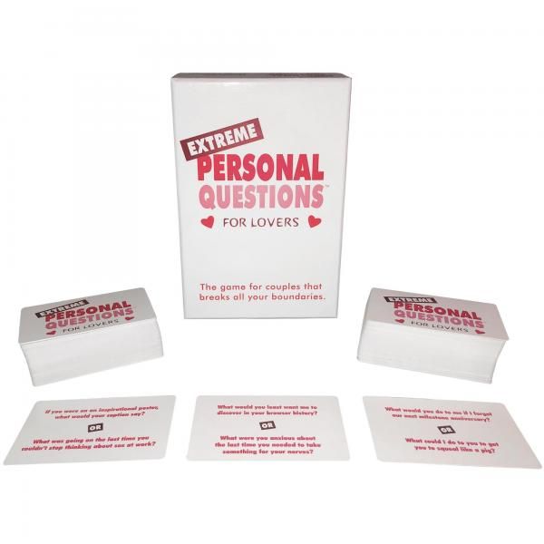 Extreme Personal Questions For Lovers Game from Kheper Games. Extreme Personal Questions For Lovers is an incredibly popular party game now for couples to play on date nights. What you learn about your lover will intrigue you. You and your lover take turns selecting cards and reviewing them. Each card has two questions, so you pick the one you prefer to ask. The other player then can either answer the question honestly or take a pass. Interesting answers earn cards, and the first player to collect 20 cards, wins the game. Includes 200 game cards, with 400 total questions, and easy to follow game rules. Categories: Party Games, Gifts, Supplies, X-Rated Adult Games, Valentine’s Day Items, Books, Adult Games, Music, Adult Party Games. 2023.