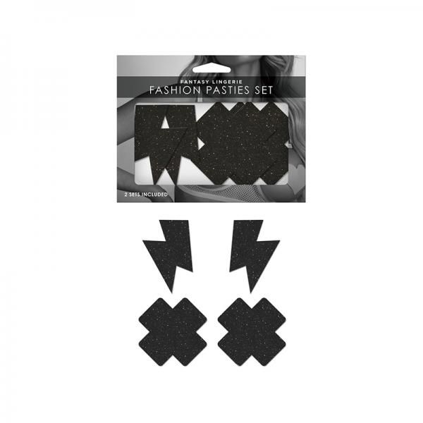 Fantasy Lingerie Black Glitter 2-pair Pasties Set Lightning Bolt & Cross Shapes O/s