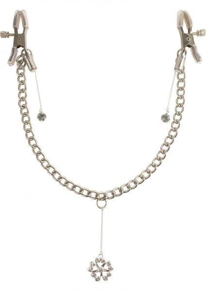 Fetish Fantasy Series Crystal Nipple Clamps. Make your nipples perk with pleasure with these beginner style Crystal Nipple Clamps. Made with durable metal clips and covered in soft rubber liners, these clamps are perfect for beginners and fetish enthusiasts alike. The amount of pressure you apply to the nipple is adjustable by turning the screw, while the hanging crystals add a touch of elegance and style!