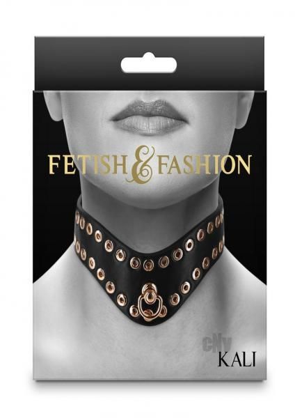 Fetish and Fashion`s Kali Collar is elegance personified. Designed for neck sizes from 11.5 to 16 inches and decorated with hollow golden studs, Kali features an adjustable buckle closure and D-ring for a tether or leash. Crafted from man-made materials (PU) and nickel-free hardware. Leash sold separately.