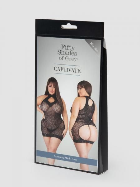 Fifty Shades Captivate Plus Size Black Lace Spanking Mini Dress from Love Honey. Capture the sultry essence of the Fifty Shades of Grey trilogy when you slip into this scandalously short spanking dress. Soft lace hugs your curves, while a keyhole neckline draws the eve to your cleavage, and the open rear invites strokes and spanks. Wow, they feel, slinky and kind of hot, yeah Fifty Shades Darker. Delicate and feminine, the intricate floral lace reveals a glimpse of your skin underneath, showing off your figure to irresistible effect. To the rear, an enticing cut out puts spanking right at the top of your to do list. Add a daringly short hemline and halter style collar neckline to this mouthwatering ensemble and your lover will not be able to tear their gaze away. Model is a 36DD, 5 ft 8 inches and a US dress size 14. She is wearing one size queen. Part of the Fifty Shades of Grey Official Pleasure Collection approved by author E L James.