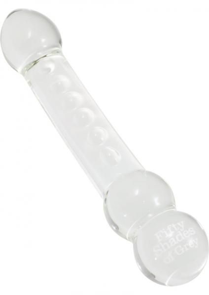 Experience explosive G-spot stimulation from the gentle curve and textures of this luxurious glass dildo from the official Fifty Shades of Grey Official Pleasure Collection. Strong and smooth, its versatile form features a dotted shaft and 2 shapely ends. The option of 2 differently proportioned ends puts varied stimulation and intensity levels at your fingertips. One end features a single, semi-realistic bulb, while the other end has a double bulbed tip and a thicker curve for deliciously filling sensations.Its long, smooth shaft is dotted with 6 raised nubs to stimulate your internal pleasure spots with each thrust. Use the curved shape to seek out and massage your G-spot, which responds particularly well to the firm pressure of the bulbous tipped dildo.Roll the smooth contours over naked skin to heighten senses and experiment with temperature play for even more sensory titillation. Keep it in the fridge before use for a sensational coolness on your sensitive spots, or run under warm water to indulge in play at body-temperature.Made from incredibly strong and durable borosilicate glass, Drive Me Crazy is super-smooth, gliding over your skin and offering delicious textured pleasure. Add a touch of lubricant to enhance the sensations further.