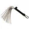 48 metallic silver throngs flicker in unison with every swing, simultaneously impacting flesh with light, sting that swiftly builds to a heated sensation. Begin with tentative strokes, building to gentle flicks and following with firmer swings for maximum effect. Measuring just 15 inches from handle to tip, this mini flogger is suitable for precise stimulation as well as offering broader swings to fleshier body parts. Total Length 15 inches, 9.5 inches Faux Leather straps.