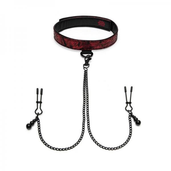 An elegant chain links the collar to the nipple clamps with a quick-release clip for easy removal.
