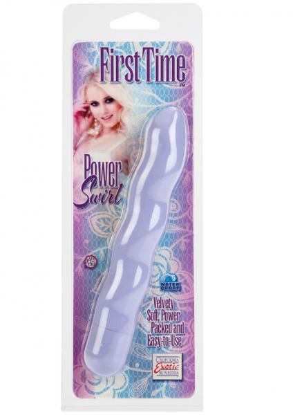 First Time Power Swirl Vibrator is available in two colors: Pink and Purple. Each sold separately. First Time velvety soft pleasure products designed for first time or experienced users. Make it a memorable experience with the First Time Collection. Velvety soft, power-packed, sensually swirled, and easy-to-use. Vibrator measures 6 inches long by 1 inch wide. Made using phthalate free, non-toxic materials ABS plastic with a Polyurethane PU cote. Vibrating sex toy requires 2 AAA batteries, not included. Always clean before and after use. Water based personal lubricant is recommended. First Time Power Swirl is a registered trademark for California Exotic Novelties.