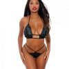 Whether you’re in the bedroom or at the club, let your curves do the talking in this exclusive 3-piece set featuring a triangle cup bra with sheer fishnet cups, a tie back closure, a long sleeve mock neck crop top, and a matching g-string panty.