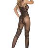 From Elegant Moments lingerie fishnet and lace bodystocking with open crotch. One size. Color: Black.
