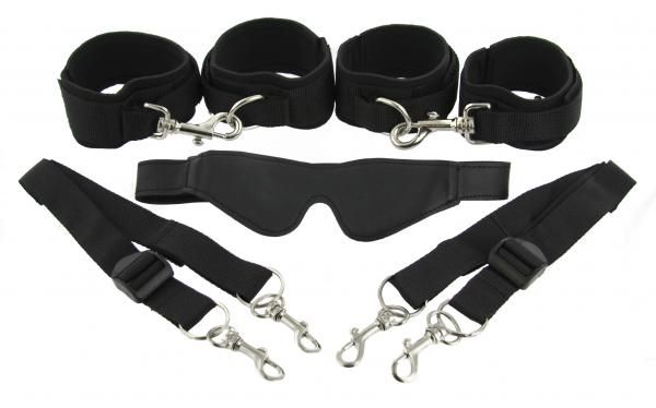 Kit includes: 1 leather blindfold, 2 wrist cuffs, 2 ankle cuffs, 2 tethers. Measurements: Cuff asjust up to 15 inches in circumference, Tethers adjust up to 27 inches long, Blindfold adjusts up to 23.5 inches in circumference. Material: Nylon, Leather, Metal, ABS plastic. Color Black.